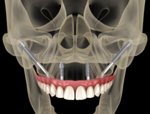 Maxillary prosthesis supported by zygomatic implants. Medically accurate 3D illustration of human teeth and dentures